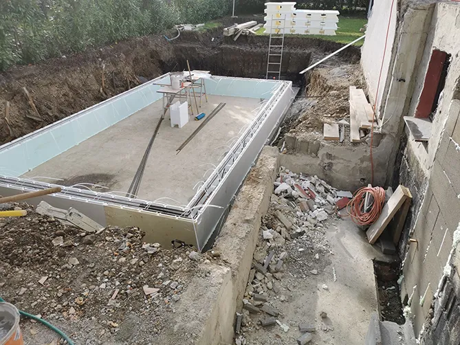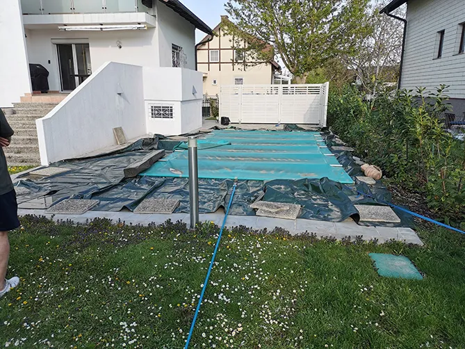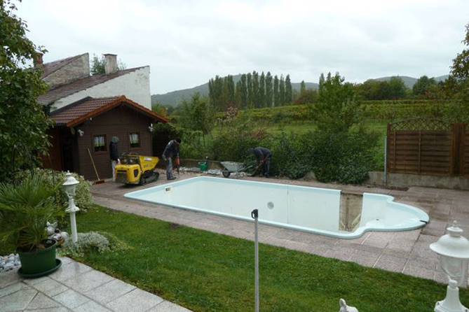Wir begleiten Sie auf dem Weg zum eigenen Schwimmbecken und übernehmen die Planung, den Aushub, das Aufstellen bzw. Versetzen, die Montage sowie die Folienmontage und die Verrohrung. Auch die Belagsplattenverlegung sowie die Pool-Inbetriebnahme und Installationsarbeiten führen wir sach- und fachgerecht für Sie durch.